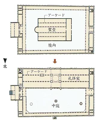 聖ヨハネ聖堂から ウマイヤのモスクへの転換、平面図 ヨハネ聖堂は 大規模な五廊式のプランをしていたので、四列の大アーケードを備え、敷地の中央に東向きに建てられていた。しかしモスクというのは メッカの方向に向けて建てられるので、ダマスクスからは南向きとなる。そこで敷地の南側の塀に寄せて大礼拝室を作り、そこにこの4列のアーケードを再利用したのである。その配置はドーム屋根のある中央部から 東に二列、西に二列というものだったので、礼拝室全体は極端に幅が広く、奥行きの浅いもとのなり、これ以後のモスクの規範となった。 それらの柱自体は ヨハネ聖堂よりもさらに古く、かつてこの敷地に建っていた 古代ローマ時代のゼウス神殿の列柱が 転用されたものだという。長さが 6メートルもあるみごとな大円柱の上に 高くアーチが架けられ、さらにその上に 小アーチの列が載せられた。この大アーケードが並ぶ空間は 実に壮大であるが、それにもかかわらず、礼拝にきた信者を圧迫するどころか、快適な居心地よさをもたらしてくれる、不思議な大モスクなのである。