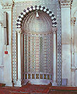 イスラーム以前のダマスクスは、ビザンチン帝国の都として、ガラス・モザイクをはじめとするビザンチン美術を 大いに発展させていた。その伝統を受け継いで、このモスクも ほとんどの部分がモザイクで装飾されていた。中庭に面する 礼拝室中央部の壁面モザイクは、緑したたる庭園や離宮、『コーラン』に説かれる 来世の楽園の姿を描いている。しかし偶像崇拝を忌避する教えのゆえに、そこには まったく人や動物の姿が見えない。あたかも、楽園は敬虔な信者が来るのを待っている、とでもいうように。 (2004年3月 "EURASIA NEWS")