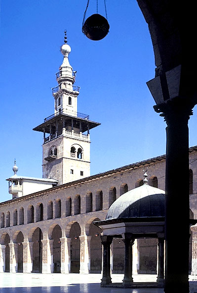 The courtyard of the Umayyad Mosque is surrouned with cloisters of two stories,