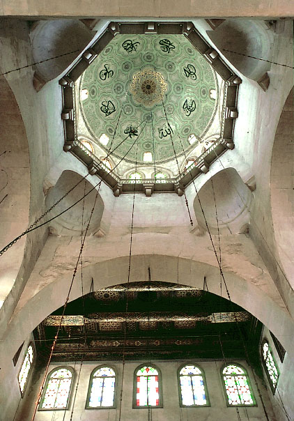 The central dome with squinches and the Qibla wall of the Umayyad Mosque. Under this dome are the Mihrab and the Minbar.