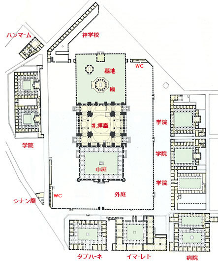 その建築的発展の詳細を知りたい向きは、拙訳書 『 イスラムの建築文化 』 をお読みいただきたい。216ページから 14ページを費やして 詳しく記載されている。また、フランス語を読まれる方には、同著者アンリ・スチールラン (Henri Stierlin) の "スレイマン帝とオスマン建築 Soliman et l'Architecture Ottomane" (スレイマン帝を フランス語では ソリマン という)Office du Livre, 1985 を お勧めしたい。スレイマン大帝とシナンが手をたずさえて オスマン建築の最盛期を作っていった過程が、豊富なカラー写真と図面を駆使して解き明かされている。