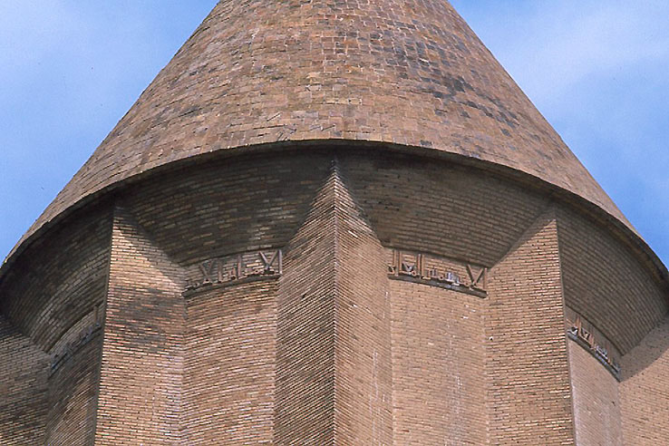 ゴールガーンのカーブース廟(塔墓) 円錐屋根の直下にレンガによるクーフィー文字のカリグラフィーの帯が、わずかな 装飾要素となっている。 文は、この建設が カーブースの命であることを伝えている。 壁面のリブも円錐形の屋根も、レンガの積み方、モルタルの目地とも 完璧な工事で、幾何学形態に 寸分の狂いも歪みもない。