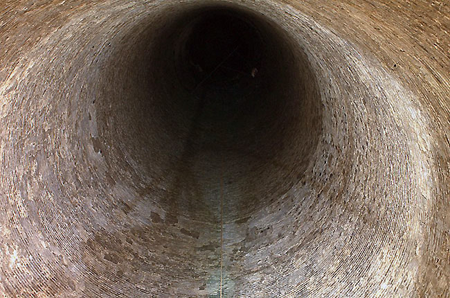 円錐屋根に開けられた小さな開口部が、上方の右側の暗がりの中に見える。