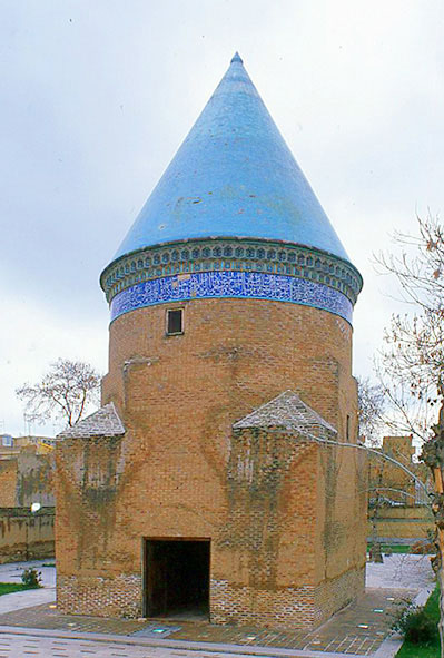 カズヴィーンのハマドラー・モストーフィー廟 モンゴル時代の1350年 円錐屋根はタイルではなく、青緑の釉薬をかけたレンガ積み。 正方形プランから円形ドラム(胴部)への移行部も、アルメニア風の処理である。