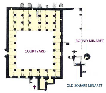 The plan shows the typical Arabic type with a nearly square courtyard of sides about 25m surrounded by hypostyle halls with thick round pillars. It is totally made of bricks covered with earthen plaster, giving a sole color to the whole surface together with the ground, the thickness of the pillars is 1.6m and that of the circumferential walls is 1.5m, all of which results an impression of an extremely simple and robust edifice.