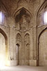 Among buildings surrounding the courtyard, that of the Macca side is called eHaramf (worship room) and the other three eRiwaqsf. Early mosques, which began with the Prophetfs Mosque in Medina, had wooden roofs with horizontal beams on brick or stone walls to walls. It seems to be a better image for an actual Arabic type mosque to have cut a central square part including its columns and beams out of a large flat hypostyle hall to get a courtyard than to consider that independent corridors encircle a courtyard. Riwaqs are a continuation of the worship hall and the courtyard is also a worship place. However, masonry arches, instead of horizontal wooden beams, came to be built across columns, the continuation of arches and their above small walls came to emphasize the boundary of the courtyard. Furthermore, since Ottoman mosques clearly separated the worship hall from the courtyard (rather forecourt) as spaces, the courtyard came to be surrounded by galleries like Western abbeysf cloisters. To begin with, European cloisters originated in the ePatiof of Arabic architecture brought to Spain and the courtyards of ancient Roman houses. On the other hand, Persians introduced Iwans into the Arabic type mosquesf courtyards. The Iwan is a large, arched opening framed square by an upper wall with its inside space covered with a half dome or a semi-cylinder vault, becoming a half exterior space despite being roofed. Its origin goes upstream to the Sassanid Persian palacesf half outside living or audience spaces, much earlier than the advent of Islam. At the remains of Ardashir Ifs palace from the 3rd century at Firuzabad, a great Iwan spanning close to 13 meters can be seen.