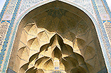 ![]() Muqarnas of the Lotfollah Mosque, Isfahan Where did such a peculiar decoration come from? Its primitive origin is said to have been in the form of squinches supporting brick domes at four corners. In the Friday Mosque of Zavareh, each squinch arch has an unstable trefoil-arch inside, which can barely stay there because the load of the dome is not borne by it but by the squinch arche, small arches on both sides are inclined forward but not so much, and joint mortars bind these parts not a little. The overall formation by these elements, together with rear vertical small arches, carry out an extremely intricate but geometric three-dimensional artistic effect. Squinches of the Gonbad-e Khaki & the Friday Mosque of Zawareh This skillful way can also be seen in the north dome (Gonbad-e Khaki) of the Friday Mosque of Isfahan and was carried out on an extensive scale at the western Iwan of the same mosque, spread to the entire half-dome ceiling on a square plan. Forwardly inclined pointed arches lean to each other at right angles, inside containing two curved triangles each. They pile up successively one over the other, composing a bold three-dimensional formation that had never been seen by anybody before.