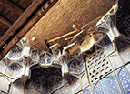 Although the decoration on Islamic architecture is fundamentally plane patterns, there is also another original Islamic method of ornamentation, deviating from that. As it gives an impression as if it were stalactites in a limestone cavern or a large-scale honeycomb, it is called stalactite decoration or honeycomb vaulting in English, but intrinsically eMuqarnasf in Arabic. Muqarnas is comprised of numerous three-dimensional geometric parts of projection and depression with concave and convex curved surfaces.