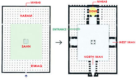 As I wrote on the page of gClassification of Mosquesh, the most classical mosque was eArabic typef, that is the simple hypostyle hall, on which Persians added new elements: domes and Iwans. While they built a dome above the center of the worship room, they also set Iwans at the center of each Riwaq and Haram (worship room) surrounding the Sahn (courtyard), with the result of establishing the eFour-Iwan type mosquef.
