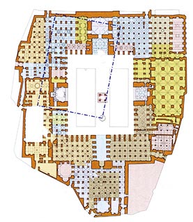 ![]() Ancient Iwans in Firuzabad and Taq-e Bostan Persian Islamic architecture inherited this element, using it at the center of the facade of the worship hall in a mosque to emphasize the central axis toward the Mihrab at the outset. It gave a strong accent to the monotonous arcade of the worship hall facing the courtyard. Such brilliant Iwans were applied to not only mosques but also palaces and houses as well as madrasas and mausoleums, in short, almost all buildings in the Islamic sphere to function for various usage, providing a pleasantly shaded semi-outdoor space. For mosques, Persians placed Iwans not only on the Qibla (direction to Macca) but also on all faces enclosing the courtyard, inventing the eFour-Iwan typef mosques, and along with a symbolic central dome on the worship hall, they established the ePersian-type mosquef that is far more articulated and distinguished than the eArabic-typef mosque.