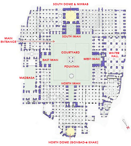 However, as seen in the schema shown below, notwithstanding having made a symbolic symmetric courtyard, the situation of the entrance passage seems to be very strange, looking to have been forcedly put in an unsuitable part of the Riwaq. Notwithstanding this appropriate stage, the North Dome (Gombad-e Khaki), facing with the South Dome in a distance, was constructed by the Wazir, Nizam al-Mulk, on that axis further north of the Northern Iwan. In those days the eastern and western Iwans were also erected forming a Four-Iwan type mosque favorably, but in the next era of Il-Khanate dynasty was constructed the North Hypostyle hall, which connects the Northern Iwan and Gonbad-e Khaki, resulting that the Northern Iwan lost the function of the entrance to the mosque. Thus, the mosque might have been compelled to assign a part of eastern Riwaq for the anomalous entrance.