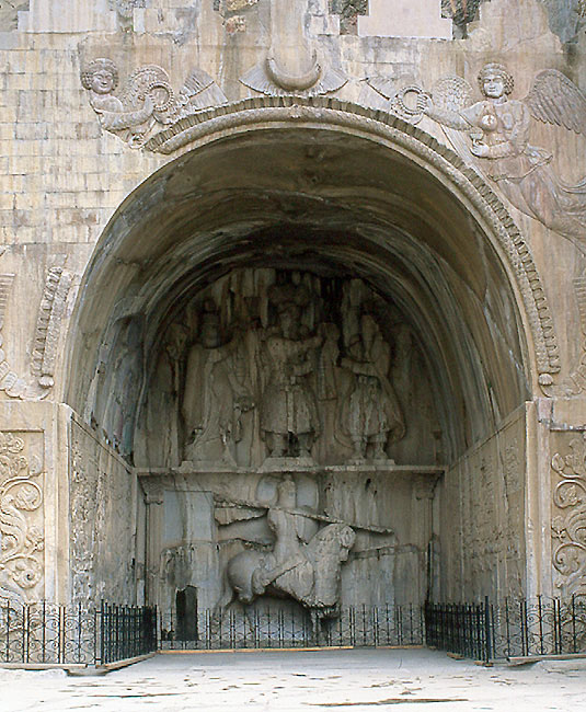 The cave tomb of Khosro II, 6th century, Taq-e Bostan near Kermanshah Although this is not a stone masonry building but a cave tomb, its vaulted half-outside space might also be one of the origins of the Iwan of the Four-Iwan type mosque.