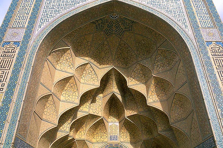 イスファハーンの金曜モスクにおける西イーワーンの天井は、レンガを積み重ねた立体的構造物である。 これがイーワーンの天井をムカルナスの半ドームにした最初の作例だと考えられる。 構造的な力の流れを明瞭に、力強く表現した、初期のムカルナスだと言えよう。