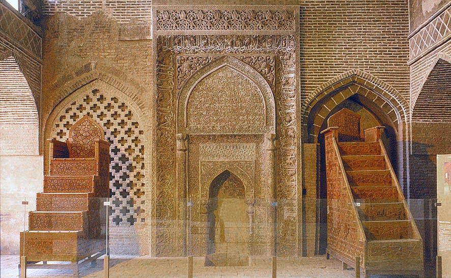 The Mihrab of Uljaitu and wooden Minbars (pulpits) on both sides, 1310, in the Friday Mosque of Isfahan, in the northern Riwak neighboring the west Iwan. It is elaborately decorated with stucco carvings in foliage patterns and calligraphy.