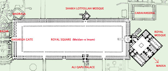 The primary explanation is the principle that every mosque should be turned in the direction of Makka. Here there is a gap of 45 degrees between the Royal Square and the direction of Makka, which is diagonally on the right backward against the entrance of this mosque; in order to resolve this gap, the explanation they gave was that such a long curving passage was needed. To begin with, since this is not a mosque for general followers, but the kingfs private oratory (there is no minaret for calling to come to worship), it is even unnecessary to make it face this square. To a great extent it is natural to erect it in the palace quarter, as is the case with the two Moti Masjid (Pearl Mosques) in Delhi and Agra, India.
