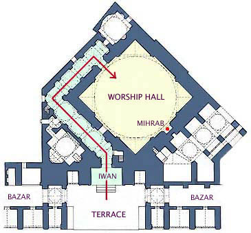 Though the worship hall has a square plan, it converts quite easily into an octagon solely in laying the eight pointed arches of the same shape continuously, then covers the whole space with ease by a smooth dome. (In "Eurasia News" 2004) E-mail to: kamiya@t.email.ne.jp