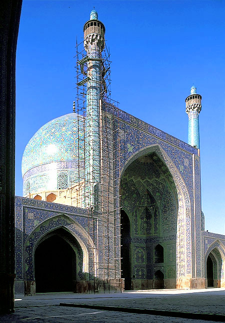 The imposing south Iwan accompanied with two Minarets. and the back dome of the worship hall, totally covered with faience tiles.