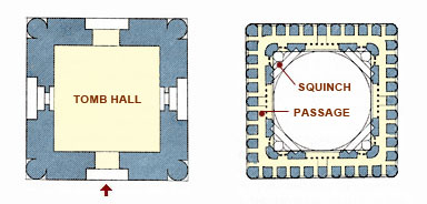 On the upper part of the interior walls stand eight small arches, including four squinches, side by side in an octagonal circle. As the load of the dome is propped up by those small arches, the architect did not make the inside of each arch a bearing wall but nstead a light latticed screen or openings to allow light. In the corner squinches in particular, his play was remarkably bold, making an excessively decorative effect with half arches in a diagonal direction and other elements. Similar formative patterns, made by means of piling brick, are applied to the whole building, inside and outside; this is the main feature of this mausoleum.