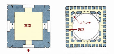 廟やモスクなど ペルシアのドーム建築は、イスラーム以前のゾロアスター教の「チャハル・ターク」形式を受け継いだ。それは 正方形プランの四方の壁にアーチ開口をあけ、上にドーム屋根をかけた、ササン朝の拝火神殿の形式である。サーマーン朝の廟は まさにこれで、9.3m角の正方形の墓室に、内径 5.7mのドーム屋根をかけた レンガ造建築である。 ドームの支持方法