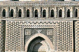土に釉(うわぐすり)をかけて焼く 彩釉レンガやタイルの技術が まだ流布していなかった時代、ペルシア圏のレンガ建築は、ただ レンガの積み方による凹凸のみで 壁面を装飾した。その あらゆる積み方を試み、「レンガの技法」の百科全書となっているのが この廟であって、その飽くなき芸術的探究心には 畏敬の念さえ覚えるのである。