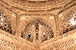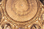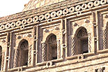 壁面上部には スキンチを含め8つの小アーチが円環状に並ぶが、ドームの荷重を受けているのは 小アーチであるから、各アーチの内側を耐力壁にせず、格子スクリーンにしたり 開口を設けたりして、外部の光を取り入れている。とくに コーナー・スキンチの内側では、さらに小さなアーチや 対角方向の半アーチを組み込んだりして、造形的な遊びを試みている。それと同巧のレンガ積みの造形パターンが 建物全体にほどこされていることが、この廟の特色である。