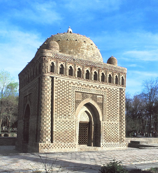 The west facade of the mausoleum of the Samanids (Qubba al-Saman), Bukhara. A cubic building crowned with a dome with four small domed corner turrets.