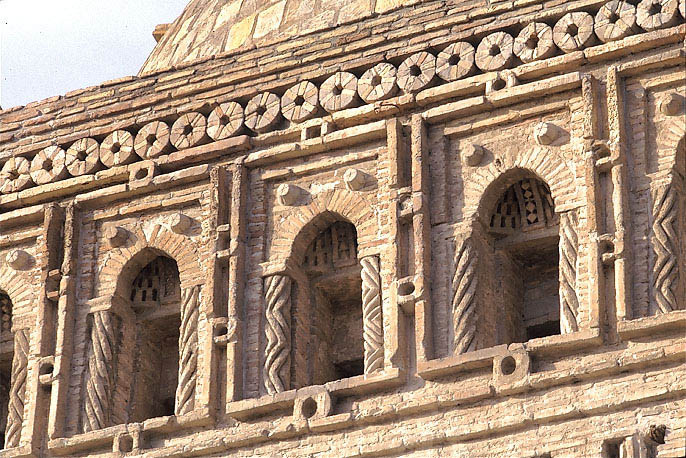 The upper part of the exterior wall, the mausoleum of the Samanids (Qubba al-Saman). Small arched windows encircle the mausoleum, embelishing it brilliantly with bricks only.