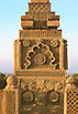 タッタの近くには もっと立派な廟建築の立ち並ぶマクリの丘があるが、このチョーカンディの墓地に より深い印象を与えられた。これらのレリーフ彫刻のパターンは、国境と砂漠を超えて、遠くジャイサルメルへと連続するものであろう。その彫刻は すべて抽象的なパターンで、なんら具体的な死者の像を与えてはくれない にもかかわらず、石ころを積んだだけの粗末なものから、立派な彫刻のある大きな墓まで並ぶ姿を眺めていると、おりしも沈みかけた落日の余光の中に、何世紀も昔のムスリムの貴族や町人の哀歓が、まざまざと伝わってくるような 感慨に捉えられたのであった。 (1996)
