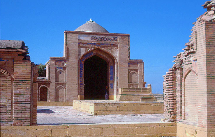 大きな矩形の境内を囲んだ立派な廟。イーワーンに青いタイルが残っている。
