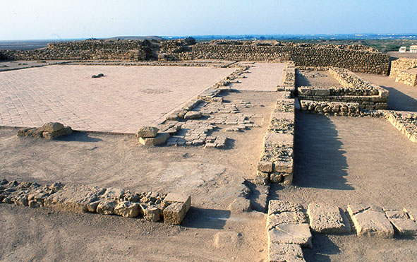 南から見た バンボールのモスク跡、727年 インド亜大陸での最古のモスクと見なされる。(カラチ〜タッタ間の中央) 中庭部分の床が修復で再舗装された。 バンボールの大モスク、発掘平面図 (From Kamil Khan Mumtaz: "Architecture in Pakistan", 1985, A Mimar Book)