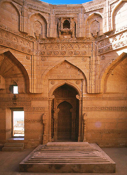 マクリの丘の ジャーム・ニザームッディーン廟、内部 墓室の内部はアーチを基本としていて、ずっとペルシアのイスラーム建築風であるが、 よく見ると表面のアーチは石を放射状にではなく、水平に積んだ持ち出し構造(corbeling)である。 そうした構造的な弱さの故であろう、ドーム屋根は崩壊してしまった。 正面のミフラーブは複雑で立体的な作りになっていて、その装飾はインドのグジャラート、 とりわけアフマダーバードのモスクでのように、実に繊細で美しい。
