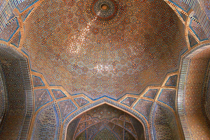 タッタの金曜モスクの礼拝室内部。 ミフラーブ前のドーム天井見上げ。 レンガ造であるが、全面的に青を主調とする彩釉タイルにおおわれていて、 繊細で清楚な印象の内部空間をつくっている。 ドーム天井は、星がまたたく青い夜空のような 幻想的な美しさをかもしだす。