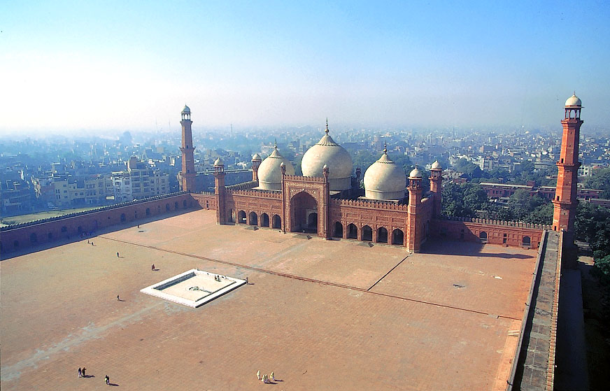 バードシャーヒ・モスク、1674年。 「バードシャー」とは 皇帝の意。 ムガル朝 第6代皇帝 アウラングゼーブによる ラホールの金曜モスクは、 広大な広場のような中庭に 彫刻的威容を誇り、中庭を含め、一度に 6万人が礼拝できる。 インド亜大陸における四大モスク(デリー、アーグラ、ファテプル・シークリー、ラホール)のうち 最後の造営になり、礼拝室の赤砂岩の壁面と3つの白大理石のドームとの対比が鮮烈である。
