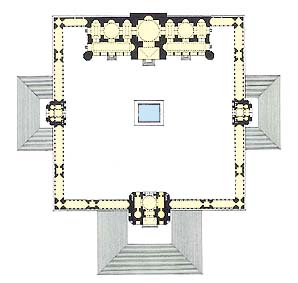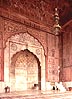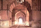 礼拝室のプランが きわめて横長のプロポーションをしているのはアラブ的で、ダマスクスの ウマイヤのモスクの流れをくんでいる。ヒンドゥ教では集団礼拝の習慣がなく、寺院の内部に大きな空間をつくることがなかったので、こうした礼拝空間に反対する理由はなかったのだろう。トルコ型の オスマン朝のモスクとの違いである。
