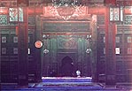 The wooden interior of the worship hall is usually crude or single colored, but there are also garishly painted mosques like the Niujie Mosque in Beijing. Plaques set up at many places show Islamic doctrinal mottos or slogans with Chinese characters, while there is mostly Arabic calligraphy on the Qibla wall.