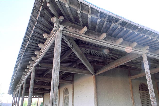 Detail of the roof strucure of the corridor, Gaisu Maza in Hami. There are arched windows, fitted with a wooden trellice, in the mud walls.