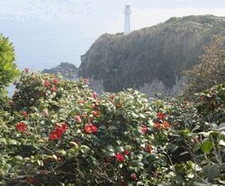 | 足摺岬の遊歩道は4〜5mほどの椿が覆い、白亜の灯台まで続く。ツバキ 15万本 1月中旬〜2月下旬 | |