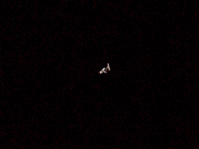 国際宇宙ステーション(ISS) この日はほぼ天頂付近を通過しました。最接近時の直線距離は401kmだったと思います。望遠鏡を真上に向けるのは大変なので、この写真は最接近を過ぎてからのものです。透明度は、夏にしてはまずまずでした。この24時間後には、接近中のこうのとり(HTV-5)がロボットアームで把持されるというタイミングでしたが、その日は天気が悪く、撮影しませんでした。油井宇宙飛行士が滞在中です。 2015年8月22日 東京都新宿区 BORG150ED+テレコンバーター69T(合成f:1400mm F9.3) OLYMPUS E-PL5 画質設定:LF ISO:400 手ぶれ補正:OFF 露出:1/400 画像補正:トリミング(等倍相当で切り出し) |