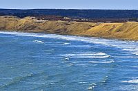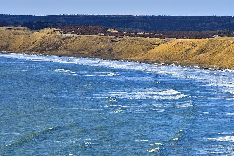 強風で海が泡立っている。 |