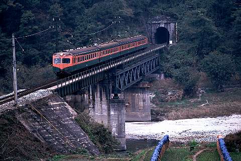 天竜峡をゆく80系。下を時折天竜下りの船がゆく。