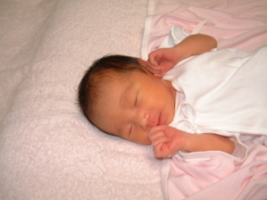 ★2003年8月16日★ 病院から退院してきたところのなっちゃん、生後5日目です。 「手が大きいね」「指が長いね」との評判でした♪ 口元と目元はパパ似、団子っ鼻はママ似との噂です。(笑)