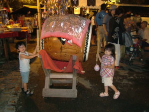 帰りに寄った「山賊」で太鼓を叩くなっちゃんとしょうちゃん 毎日が村祭りみたいな面白いお店です |