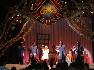 USJ内では有料で撮影のサンタさんも登場 両脇の二人が司会進行のキャストです |
