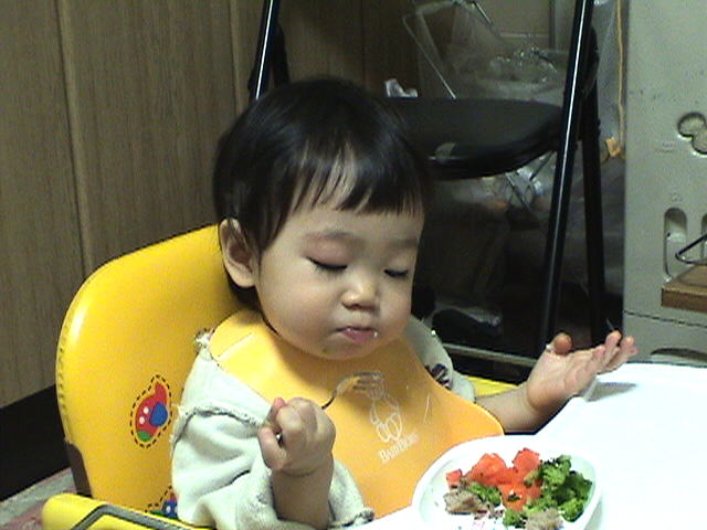 ★2004年10月31日★ なっちゃんの離乳食も幼児食に近くなってきました。 この日のメニューは軟飯にハンバーグ・ニンジン・ブロッコリーとみかんだったかな? スプーンはすくうのが難しいので上手く使えませんが、 フォークだったらご覧のように自分で刺して食べることができるようになりました♪ でも、まだまだまだるっこしいのか、途中で手づかみ食べになっちゃいますけどね。(笑) ちゃんと椅子に座って食べてくれるようになって、私は本当に嬉しいです。^^
