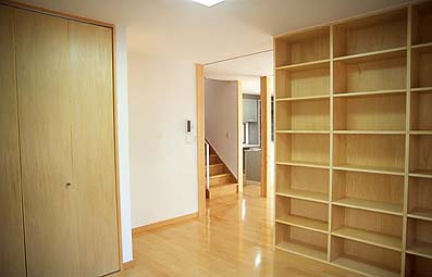 ![]() 書斎から階段部を臨む。書斎もシナ合板の大きな吊り戸で仕切ることが可能です。 |