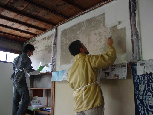 床は一部畳敷きでぼろぼろだった。 あぁ棚もぼろぼろ 壁補修 壁材を練って 一応補修