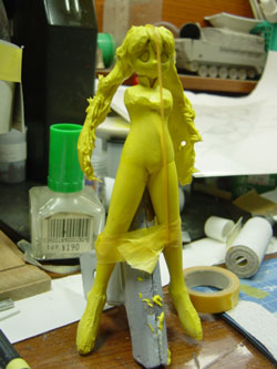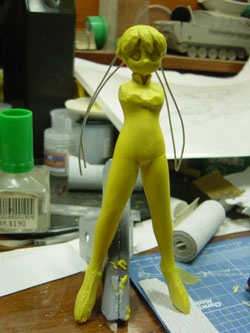 4/6 髪の毛 ボリュームがあるので針金でポリパテを 盛り付けるガイドを入れました。 とりあえず盛ってから考えることに。 |