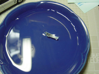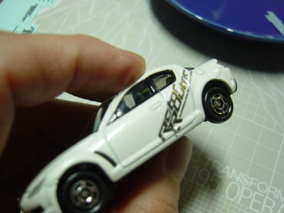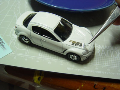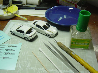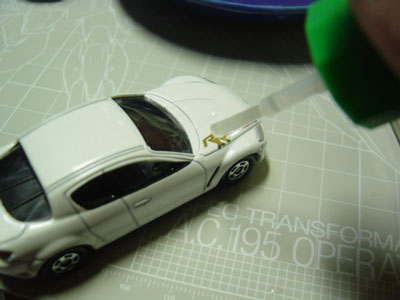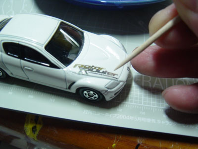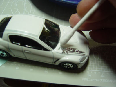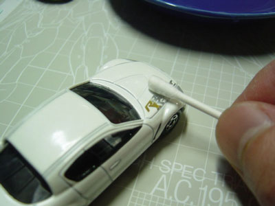 | E綿棒で水分を吸い取ります。 デカールとボディーの間に水が残っているうちは多少移動できますので、 ずれてしまった場合はツマヨウジや綿棒で微調整しましょう。 完全に水分を吸い取ったところで次の段階に入りますが、中に気泡が 残ってしまう場合があります。でも気にしないでいきましょう。 |