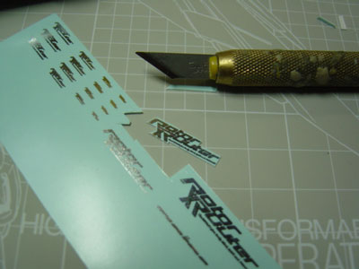 | @まず必要な部分を切り出しましょう。 プラモデルについているシールと同じ水シールですが、マークごとに 分かれていないので切り抜かなければなりません。 このときなるべく余白部分を残さないようにギリギリで切った方が仕上 がりがきれいです。 |