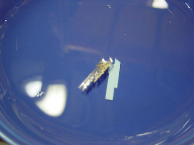 | B 1分もすると台紙が水を含みシール部分がはがれてきます。 ピンセットでやさしくつまみましょう。 大きなデカールの場合は、台紙がはがれきる前に台紙ごと春部分に持っ ていくほうが作業しやすいです。 |